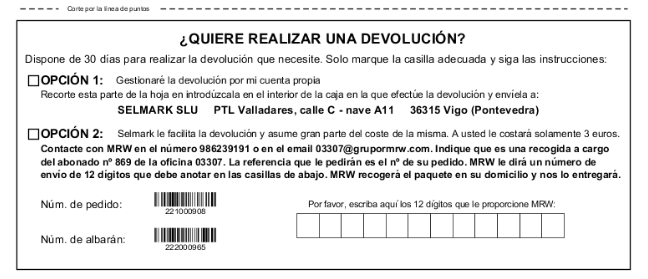 O a travéz de MRW, nuestra compañía de confianza, siguiendo las indicaciones de la hoja y donde nosotros asumiremos parte del coste de envío y para el cliente éste siempre será de 3€ que le serán descontados en el momento del reembolso.